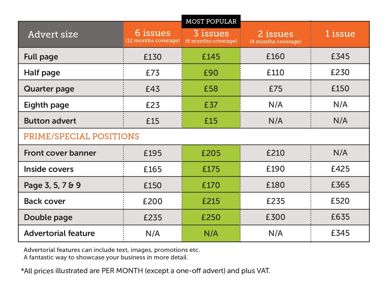 Using our professional design studio, we can design customised, eye-catching adverts, advertorials - from £15 +vat which you can use on your social media platforms for consistency. Plus - if you want to change your advert every issue - no problem!